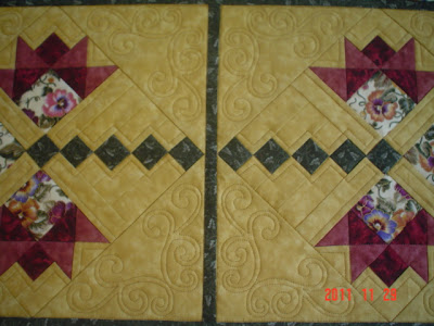 Here is a table runner with custom treatment. I used a scroll design in the open areas around the pieced lillies, and did some 1/4" echo around the piecing. I think the curvy scroll design is a nice contrast to the sharp points of the pieced flowers.